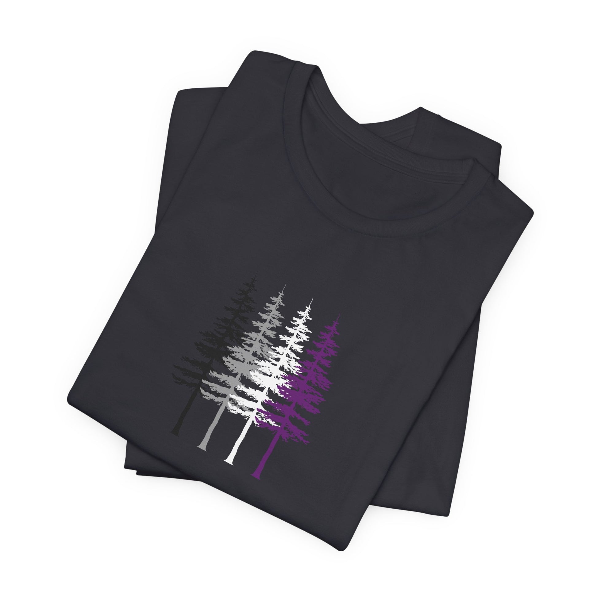 This lightweight jersey tee carries a quiet, woodsy declaration of asexual pride—illustrated as a forest silhouette shaped and shaded like the asexual flag. Soft, breathable cotton sits close to the skin while the detailed print along the sleeves and chest reads like a small, proud statement for people who find identity in nature. Wear it on walks through autumn woods, at community gatherings, or layered under a jacket for everyday comfort. The tree-flag motif blends subtlety and visibility: it’s for those who prefer meaning over loudness, who want their values visible but effortless. The retail cut keeps the silhouette clean, and the crew neckline makes it easy to pair with scarves, jackets, or a favorite tote. This tee travels from trailheads to coffee shops with calm confidence and quiet solidarity.